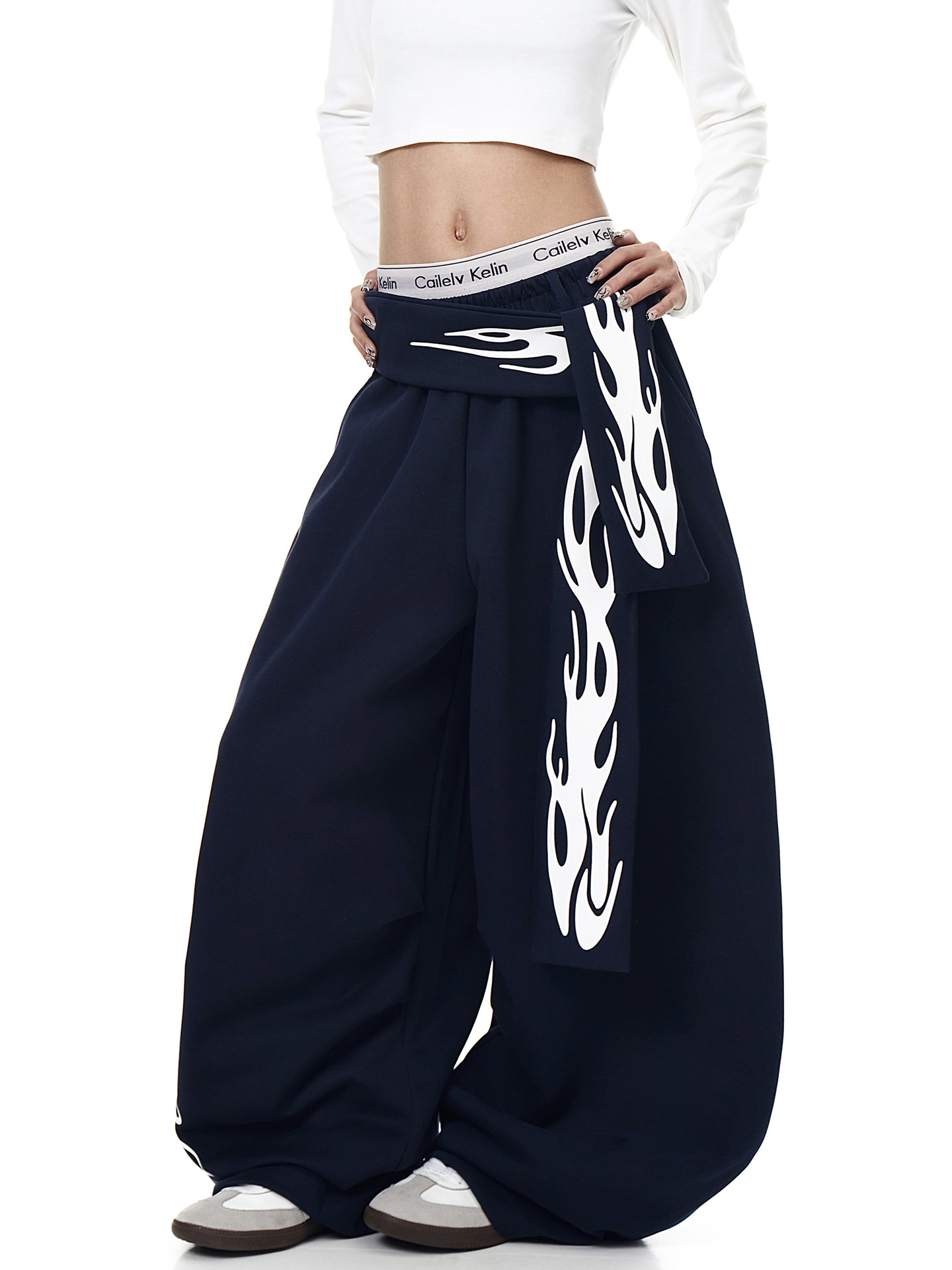 Vintage Flame Print Belted Knife Pants Unisex Autumn New Fashion Streetwear Jazz Dance Loose Wide Leg Pants - White / S