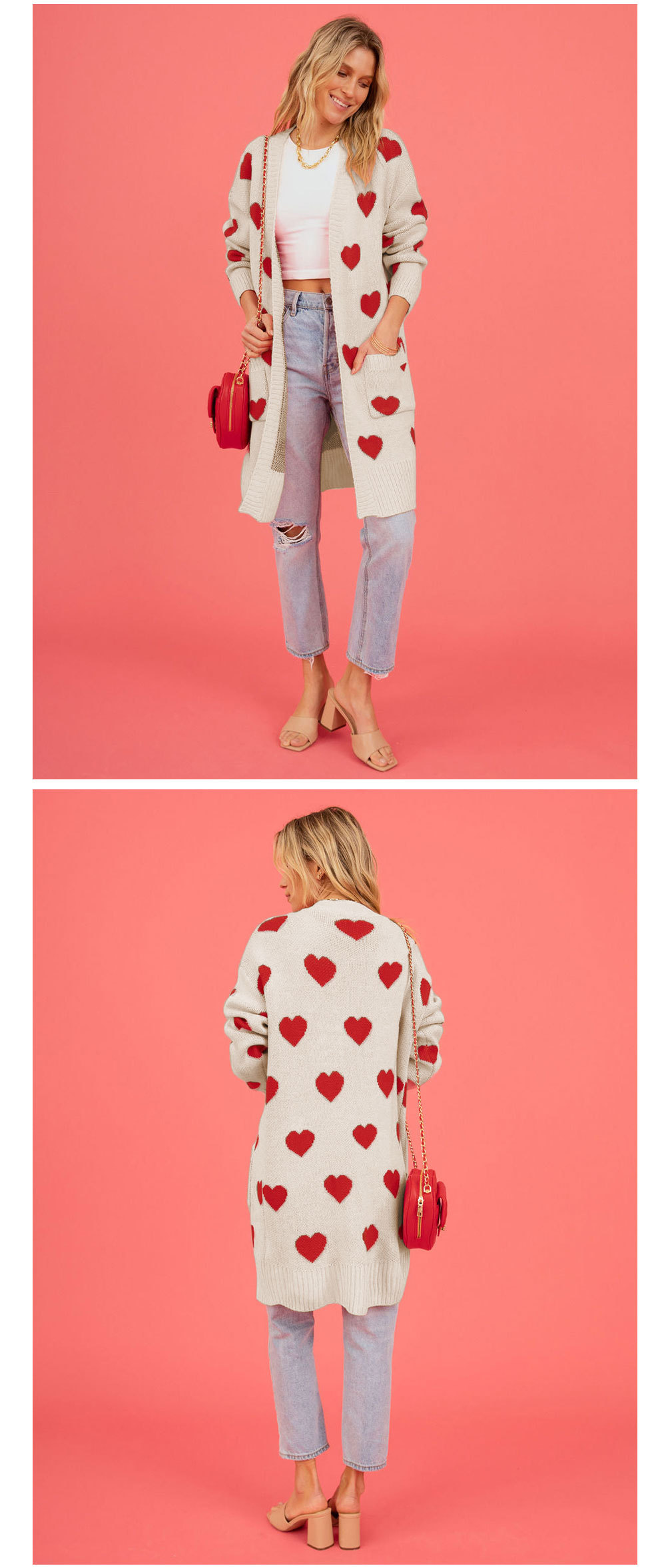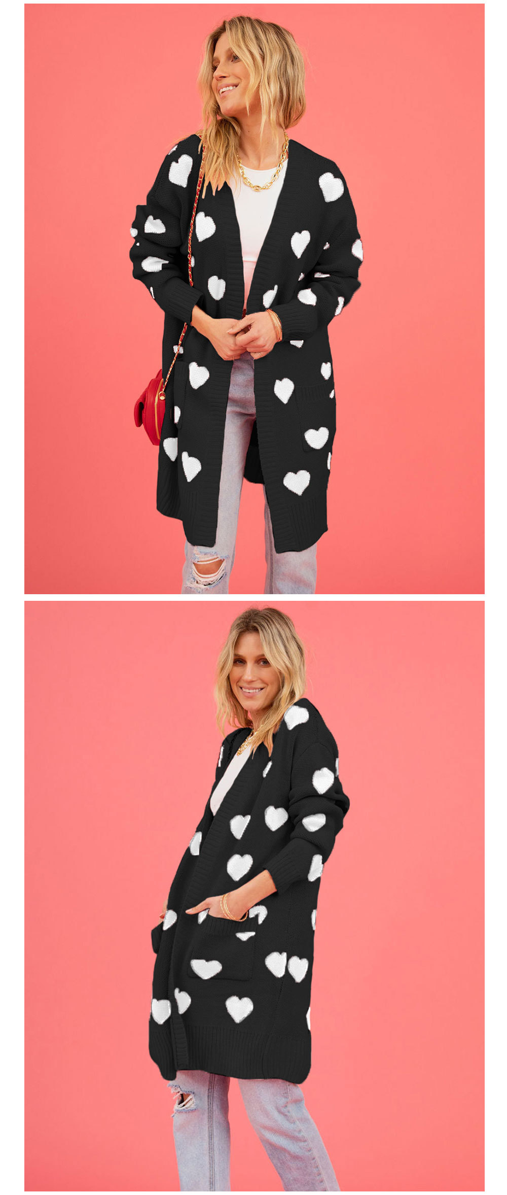 Heart knitted cardigan with heart pocket V-neck mid length jacket for women