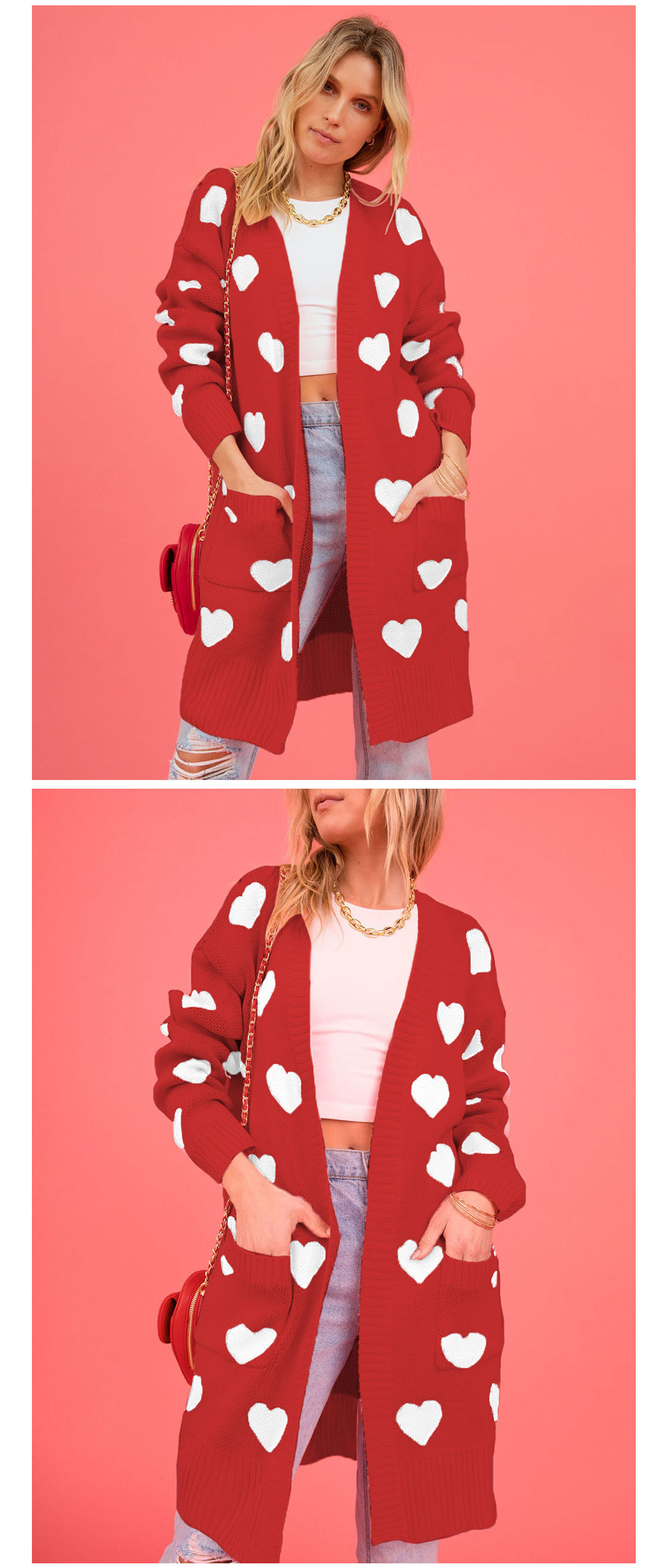 Heart knitted cardigan with heart pocket V-neck mid length jacket for women - Red / S