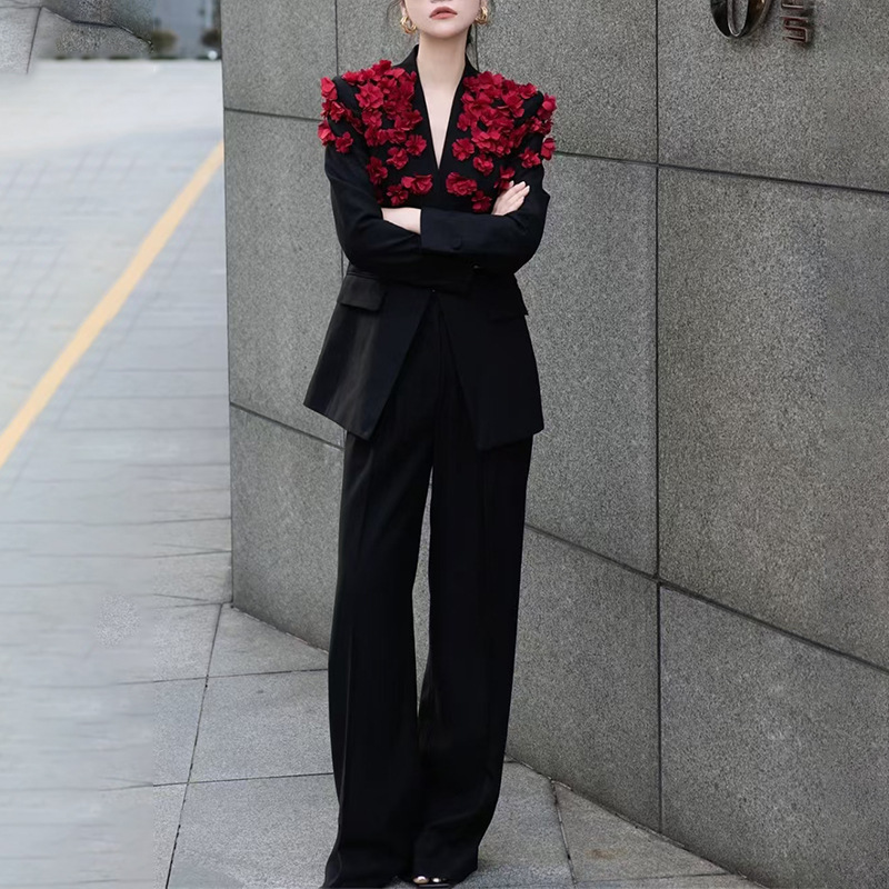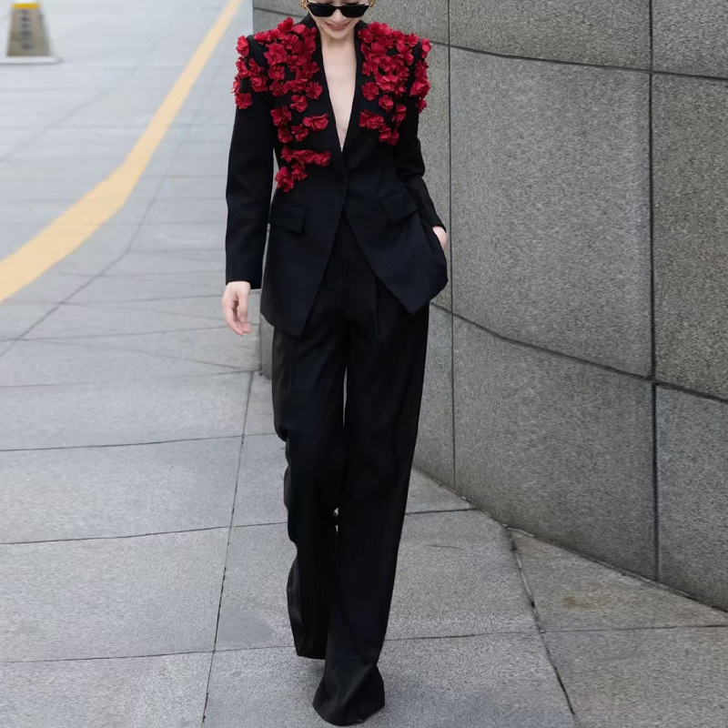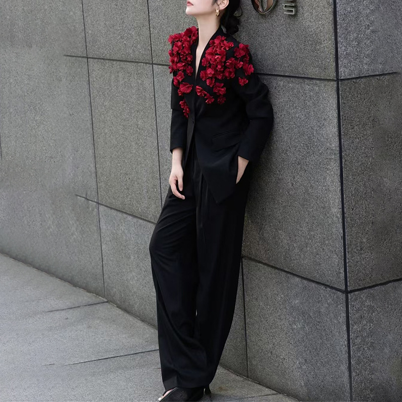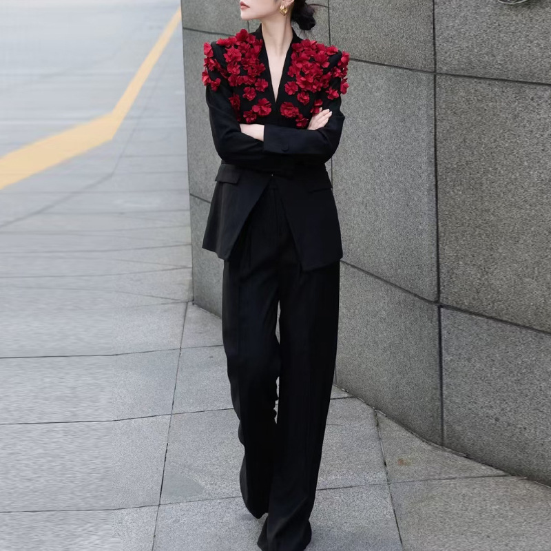 Three dimensional rose V-neck suit+high waisted straight leg pants - Black / M